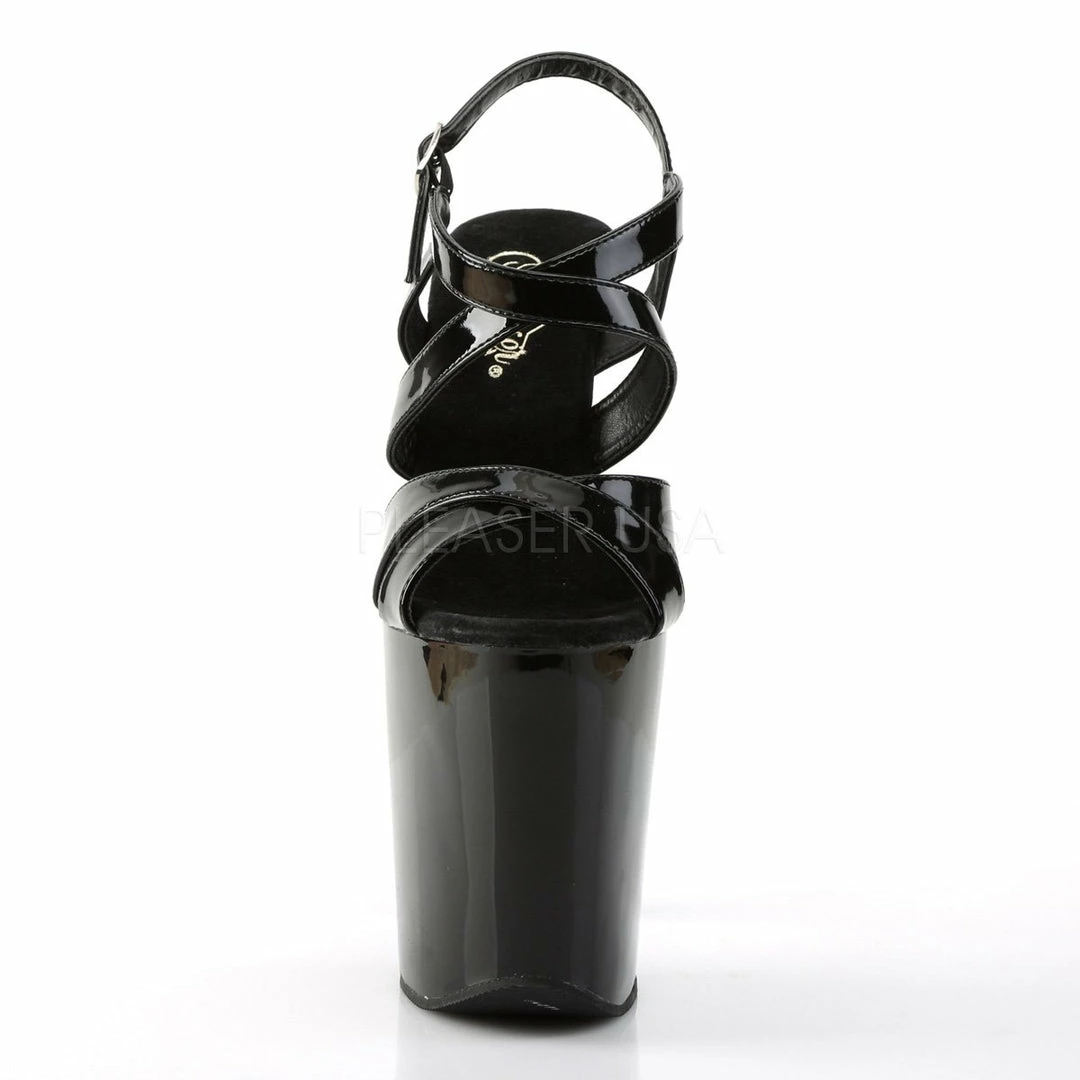 8″ (20.4cm) Heel, 4″ (10.2cm) platform criss-cross ankle strap sandal.
