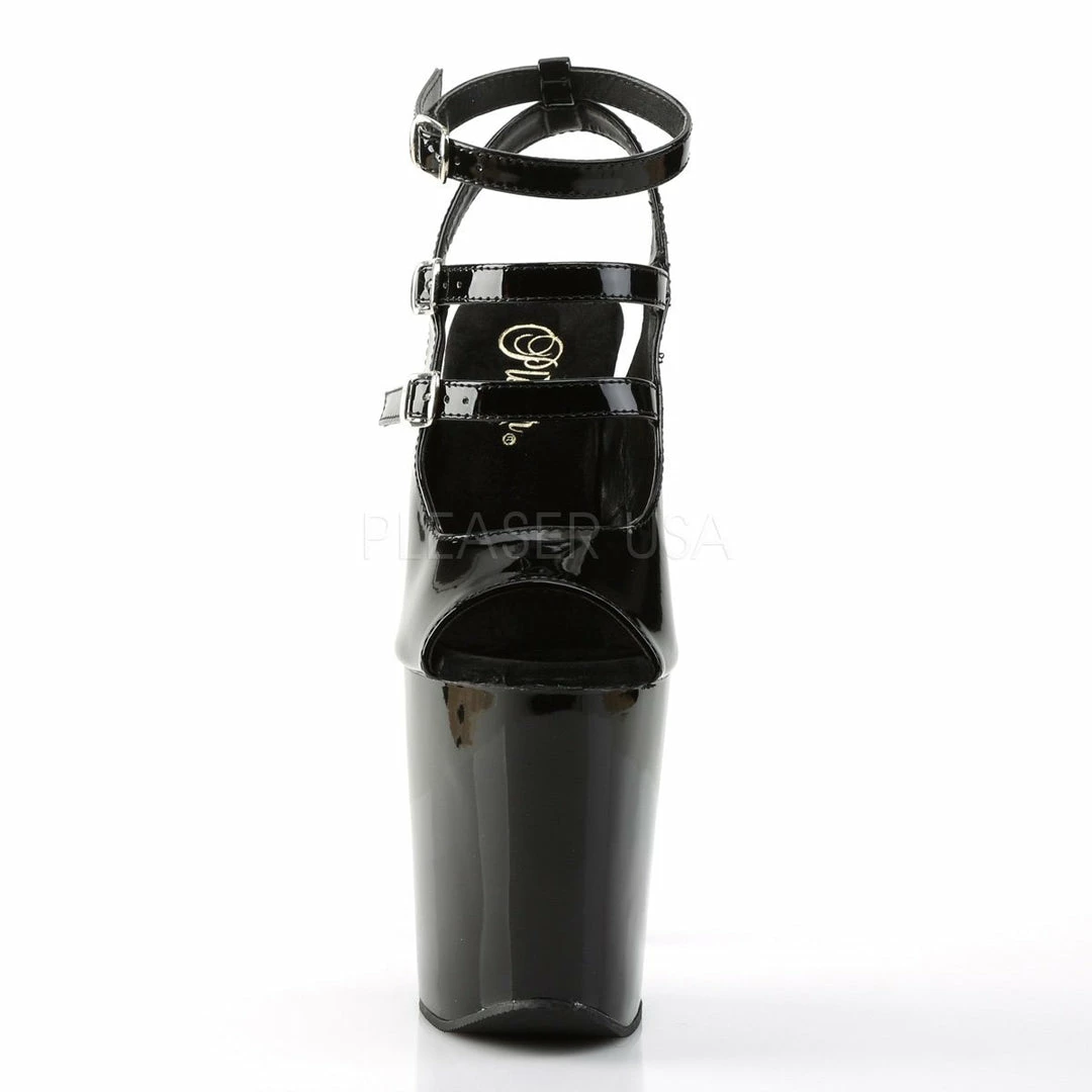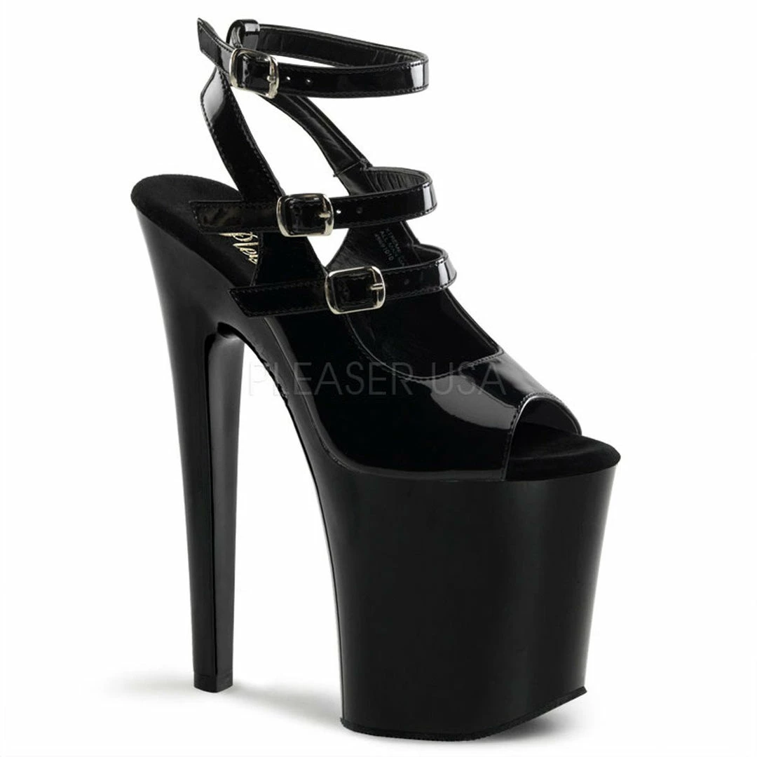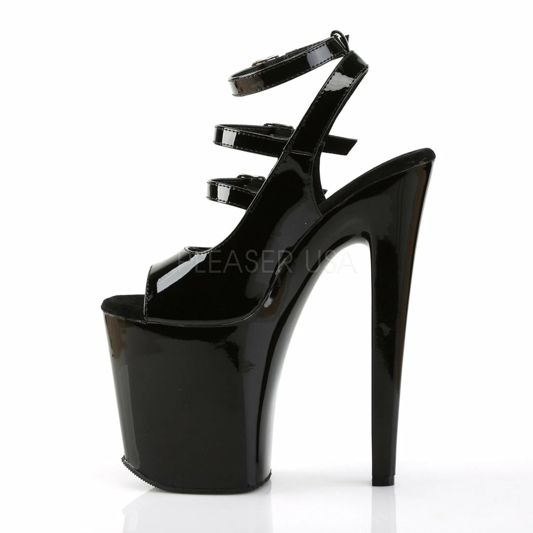 8″ (20.4cm) Heel, 4″ (10.2cm) platform strappy ankle peep toe sandal.